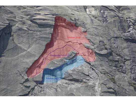Die Abbruchstelle hat weitere grosse labile Felspartien. Es ist eine Fläche von mehreren hundert m2.