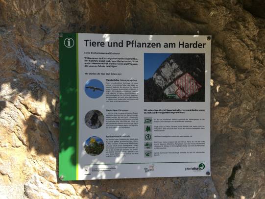 Nach einer Begehung, zusammen mit der Gemeinde Unterseen, dem Amt für Landwirtschaft und Natur des Konton Berns und ReBolting, wurde eine einfache und pragmatische Lösung für den Klettergarten Harder gefunden. Dies nachdem die Gemeinde einer Beschwerde nachgehen musste, welche dann, eine Kettenreaktion ausgelöst hat. Daraus entstanden ist diese Infotafel, von ProNatura entworfen welche ReBolting, im Auftrag der Fachstelle für Landwirtschaft und Natur des Kanton Berns, am 20.09.22 nun fix montiert hat. Sie soll den Kletterer auf die Mitbewohner am Fels aufmerksam machen, und das Verhalten jedes Einzelnen positiv beeinflussen. Respekt und Toleranz sind die Schlagworte...zudem macht die Gemeinde aufmerksam, dass das Gelände des Klettergartens zum individuellen Bereich gehört. Dies bedeutet dass ein jeder Kletterer Selbstverantwortung übernimmt!