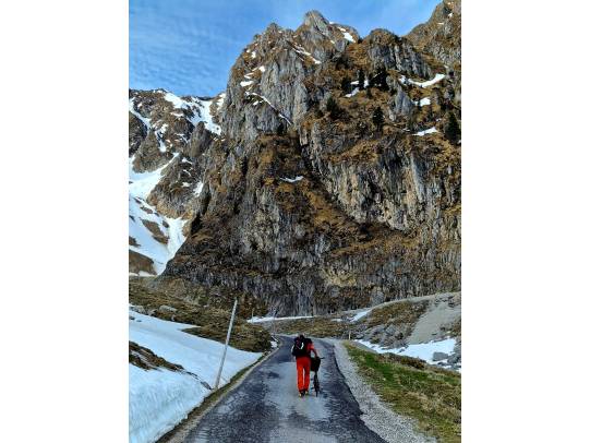 Zustieg: Auf dem grossen offiziellen Parkplatz parkieren. Dieser befindet sich von Zollhaus kommend ca. 150m vor der Abzweigung zum Kieswerk. Gegenüber befindet sich auch gleich die Bushaltestelle, falls man mit dem ÖV anreist. Achtung: die Schranke zum Kieswerk wird abends immer geschlossen. Zu Fuss, mit dem Rad oder den Tourenskiern ist man in ca. 45Min. gemäss Kartenausschnitt am Einstieg. Die Seillängen können je nach Schneehöhe ziemlich variieren, darum haben wir noch Zwischenstände gebohrt. Ideal ist sicher, wenn die Schneemenge ca. dem Topo entspricht.