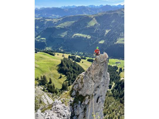 Abstieg: In 3 mal 45m in Blickrichtung Fels leicht links haltend an den Beginn des Fixseils zum „Minimatterhorn“ abseilen. Momentan ist noch ein Zwischenstand nach dem zweiten Abseilen, um die Gefahr der Seilblockierung in den 2 Tannen zu vermeiden (wir hatten keine Säge dabei, wird noch erledigt)! In der dritten Abseilstelle kann ein BH mit Schlinge geklippt werden. Vom Vorgipfel über die Route in 5 mal bis zum Einstieg.